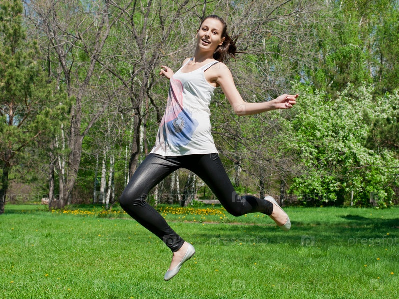 Счастливая девушка прыгает от радости в летнем парке