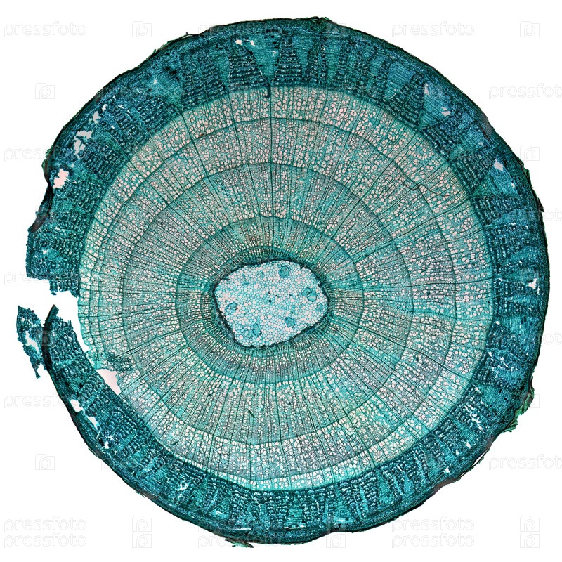 Микрофотография стебля липы, поперечное сечение, вид через микроскоп