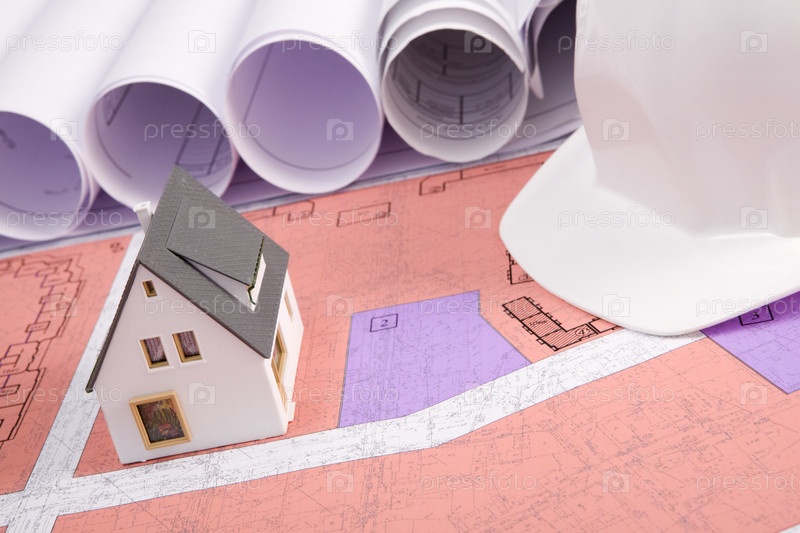 Близкий план модели дома-игрушки на чертежах с шлемом рядом