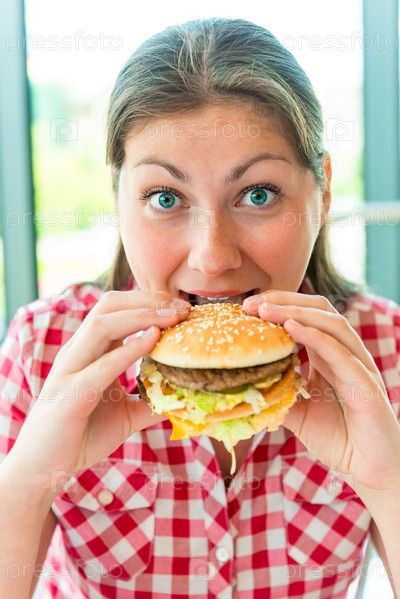 Девушка ест гамбургер