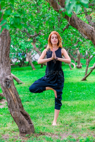 Девушка занимается йогой в парке