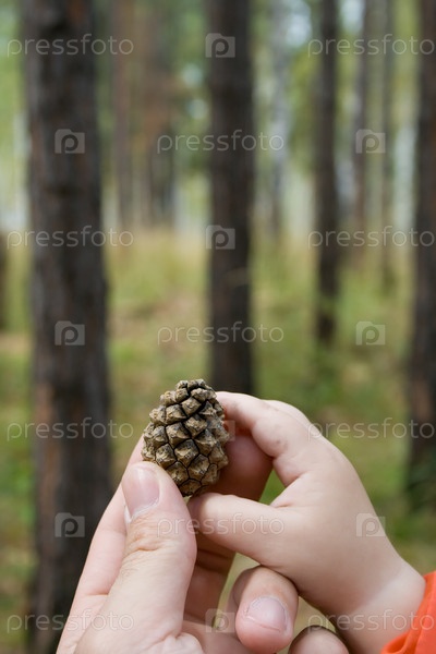 На фото отец дарит ребенку сосновый конус, там видны только руки и конус