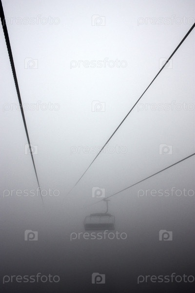 Кабинка едет по канатной дороге в тумане