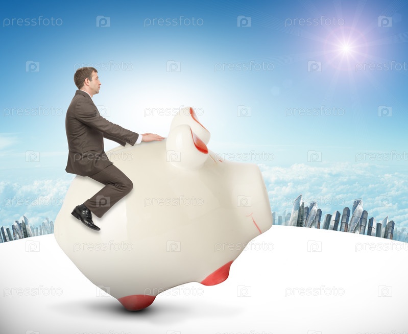 Бизнесмен, сидя на копилку на фоне природы