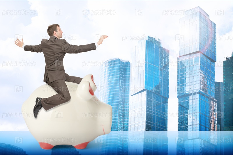 Бизнесмен, сидя на копилку на фоне города