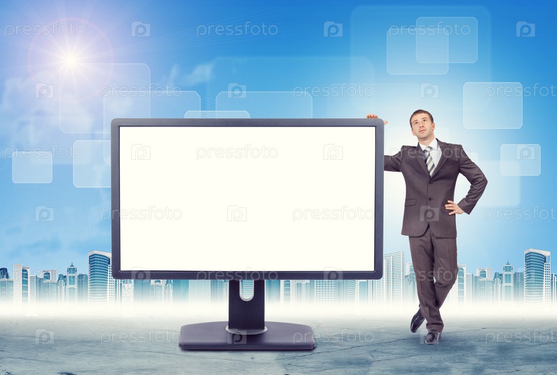 Бизнесмен, опираясь на мониторе на фоне городского пейзажа