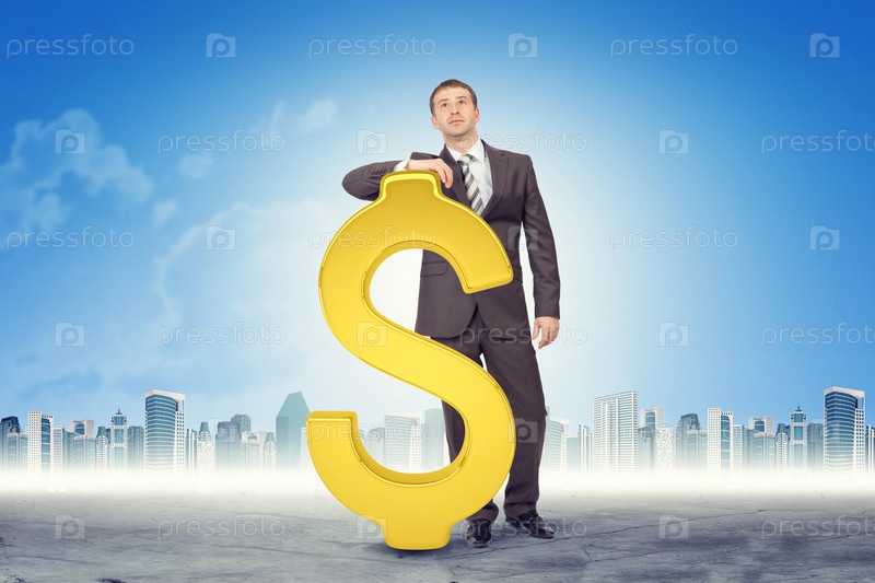 Бизнесмен, опираясь на знак доллара на фоне городского пейзажа