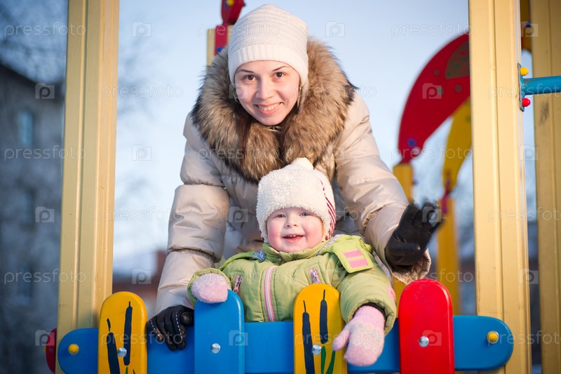 Ребенок и мама на площадке зимой