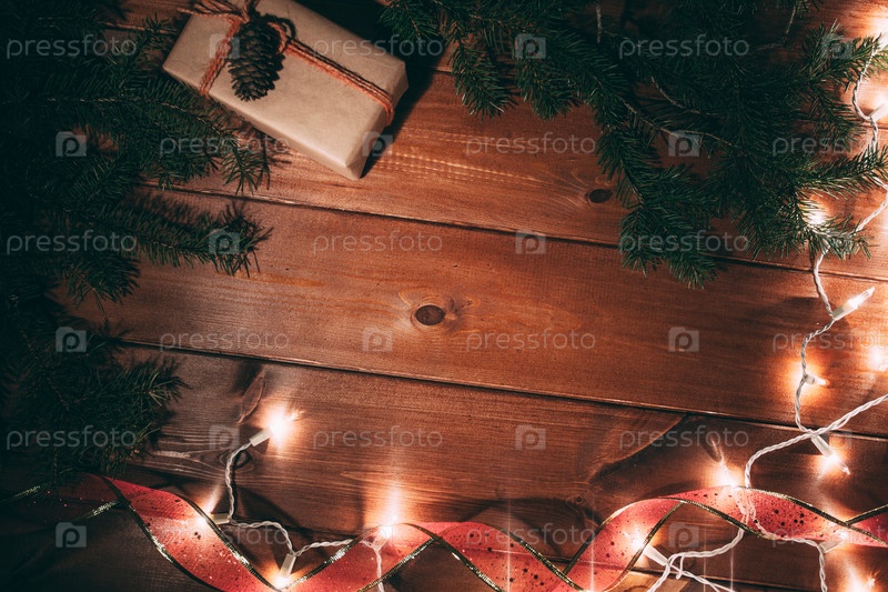 Подарочные коробки и мех дерево на деревянных фоне