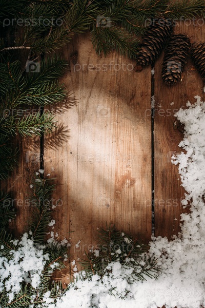 Еловые шишки и ветки на деревянных фоне