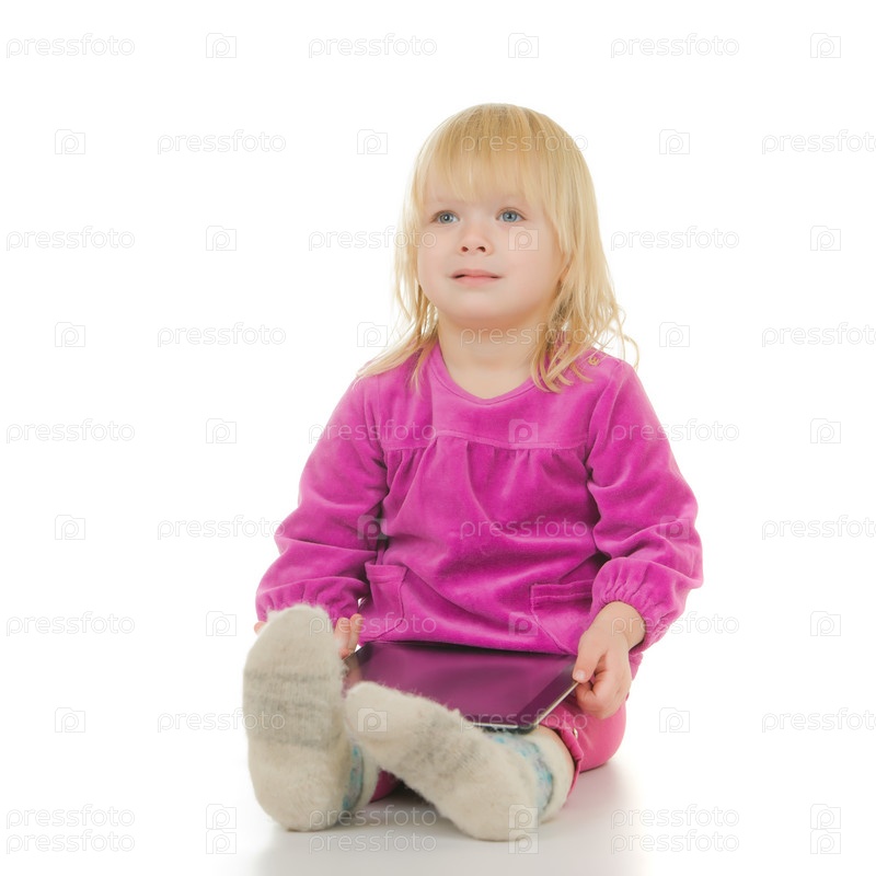 Прелестный ребенок сидит с планшетным компьютером на белом фоне