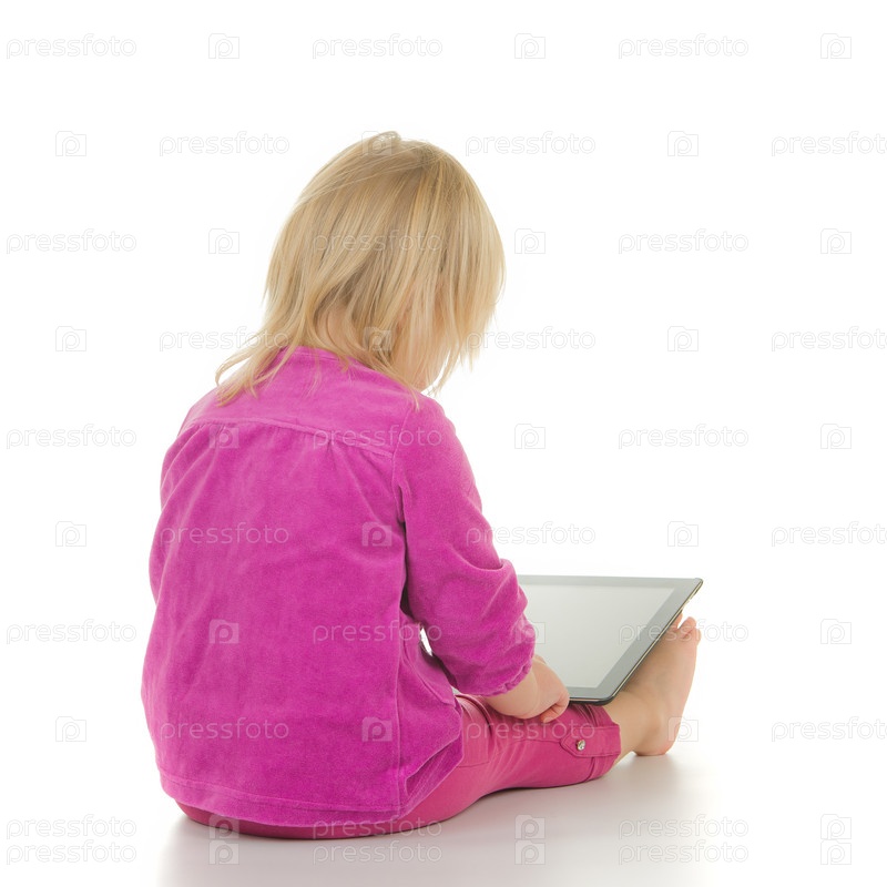 Прелестный ребенок сидит с планшетным компьютером на белом фоне