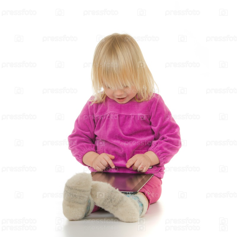 Прелестный ребенок сидит с планшетным компьютером на белом фоне