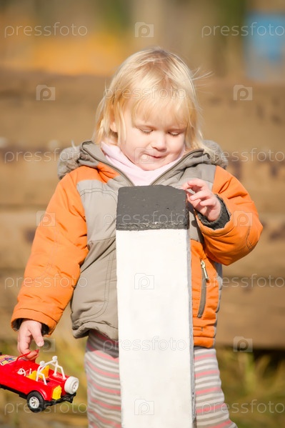 Маленький ребенок с машинкой у железной дороги