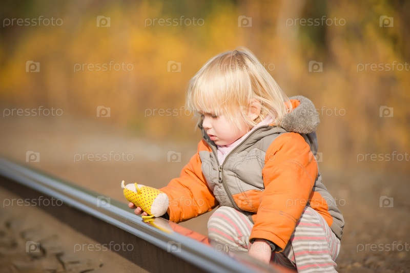 Маленький ребенок играет у железной дороги