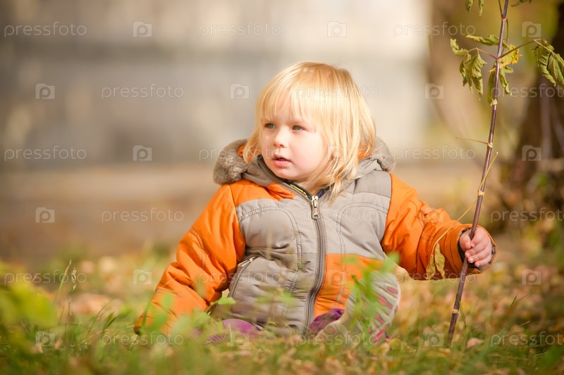 Маленький ребенок сидит на траве в осеннем парке