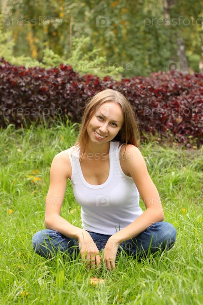 Девушка в синих джинсах сидит на траве
