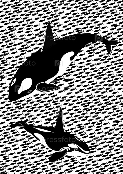 Касатки плавают среди рыбы, черно-белая иллюстрация