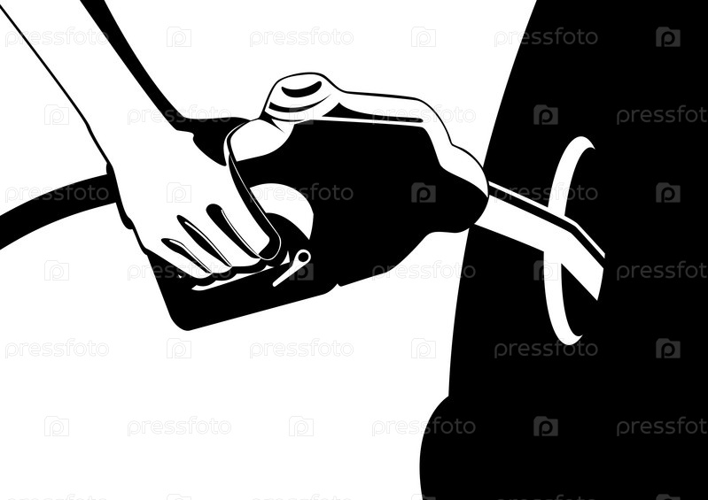 Человек заправляет машину, черно-белая иллюстрация