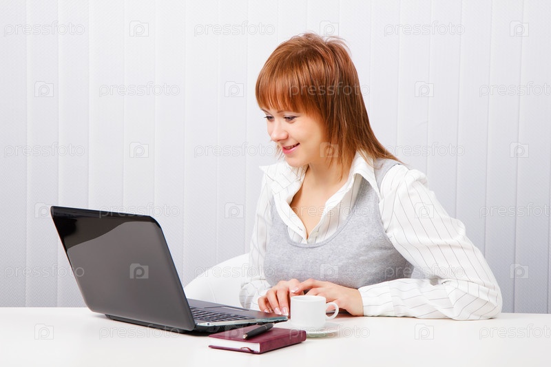 Привлекательная девушка с блокнотом и ноутбуком