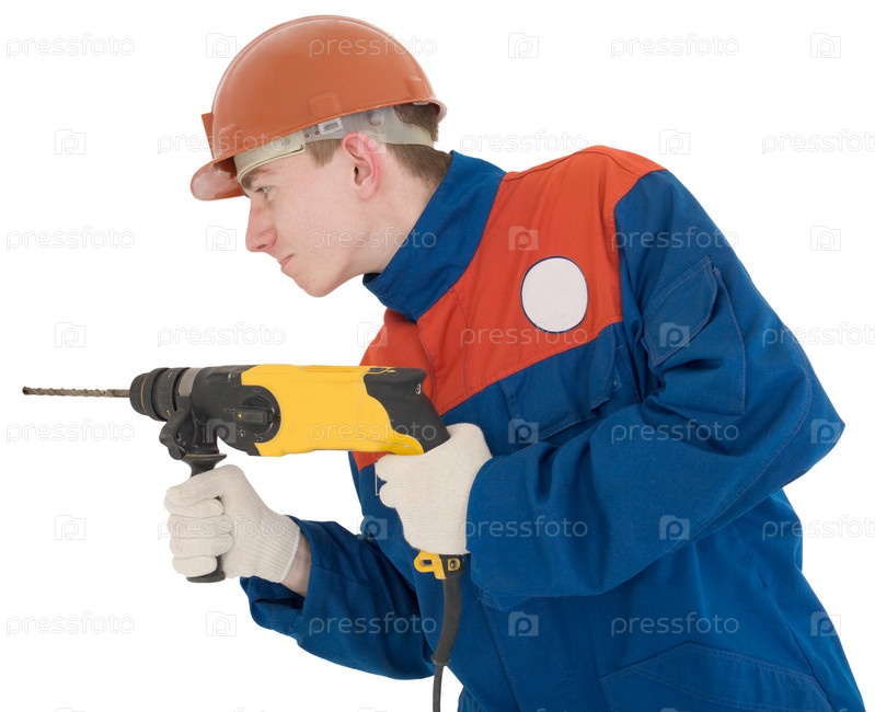 Мужчина в рабочей ткани, держащий желтый перфоратор на руках
