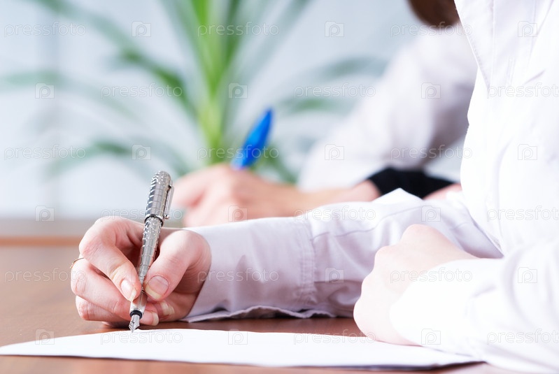 Бизнес-леди что-то пишет на листе бумаги, руки крупным планом