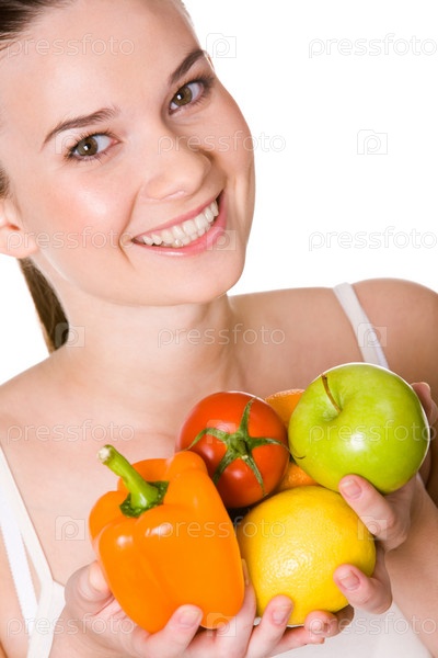 Портрет красивой девушки с различными фруктами и овощами в руках, улыбающейся на камеру