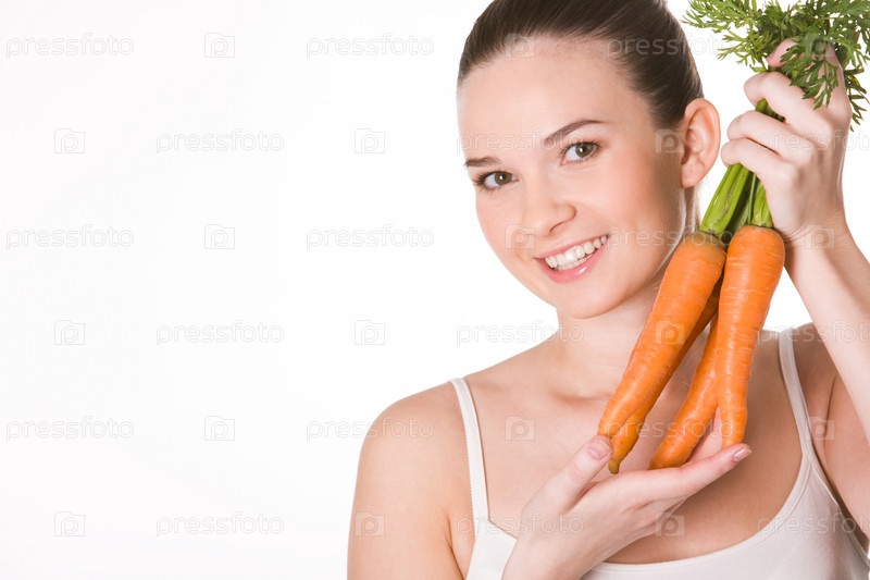 Портрет красивой девушки со спелыми морковью, улыбающейся в камеру на белом фоне