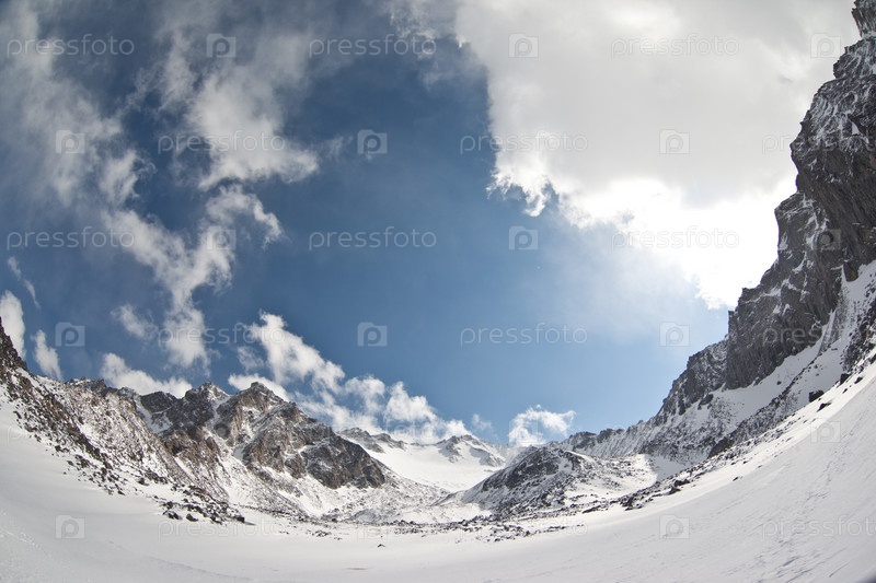Фото с рыбьим взглядом зимней горы Саян в Российской Федерации