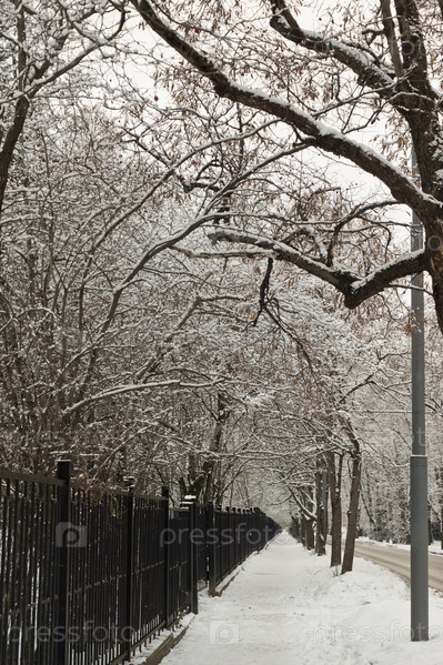 Забор, дорога и деревья в снегу