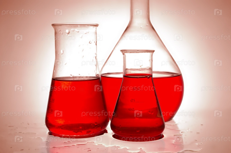 Химические реторты на стеклянном столе