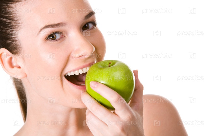 Портрет красивой девушки с открытым ртом, ест зеленое яблоко