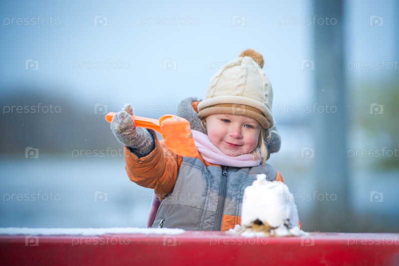 Маленькая девочка строит дом из снега