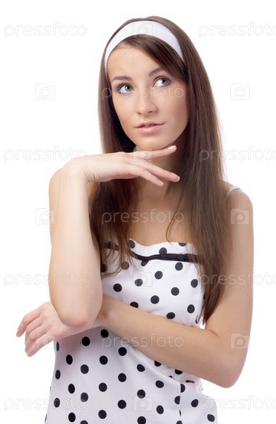 Мечтательная девушка в платье в горошек, изолирована на белом