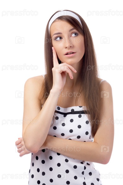 Мечтательная девушка в платье в горошек, изолирована на белом
