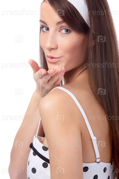Девушка в платье в горошек посылает воздушный поцелуй, изолирована на белом