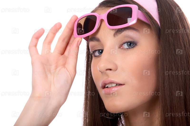 Молодая брюнетка в розовых солнцезащитных очках на белом