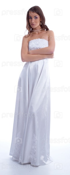 Молодая женщина в свадебном платье на белом