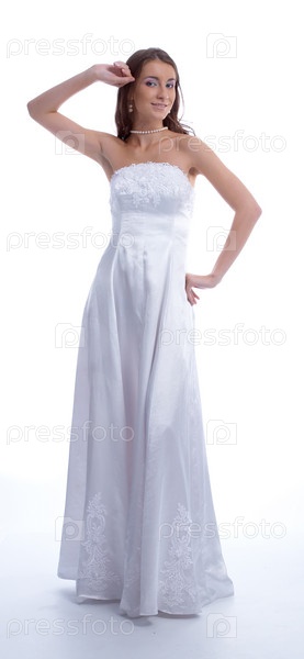 Молодая женщина в свадебном платье на белом
