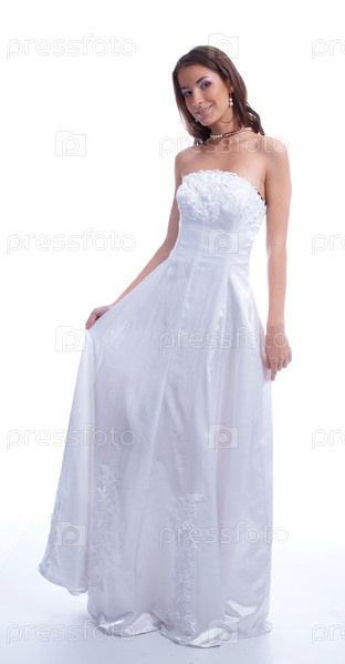 Молодая женщина в свадебном платье на белом