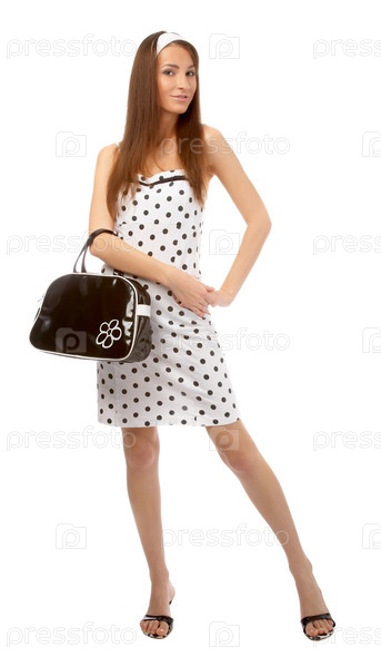 Модель в платье в горошек с черной сумкой на белом