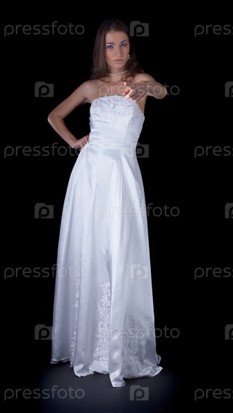 Молодая женщина в свадебном платье показывает, вперед, на черном фоне