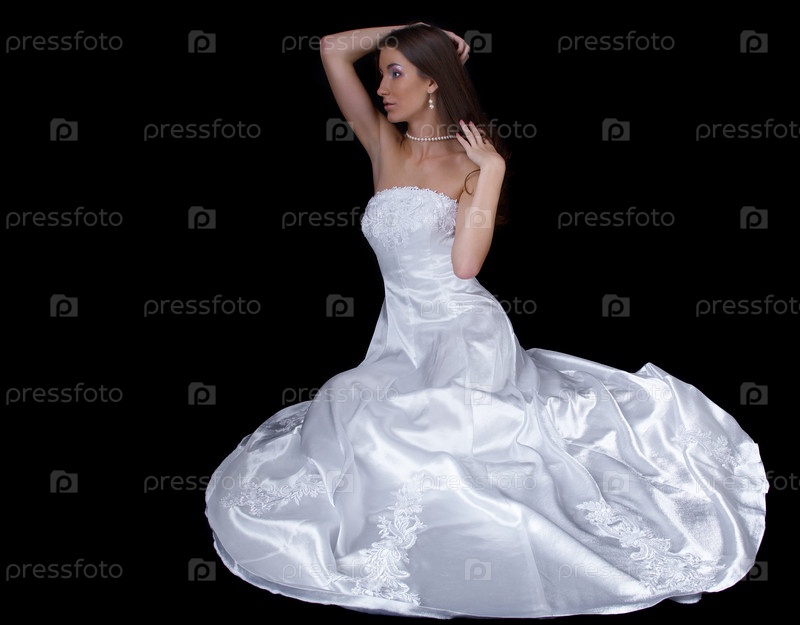Задумчивая молодая женщина в свадебном платье сидит на полу, на черном фоне