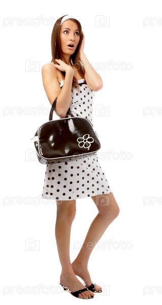 Модель в платье в горошек с черной сумкой - шокирована на белом
