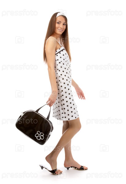 Модель в платье в горошек с черной сумкой на белом