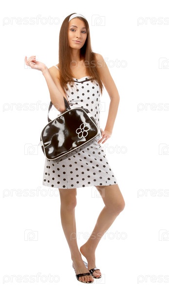 Модель в платье в горошек с черной сумкой на белом