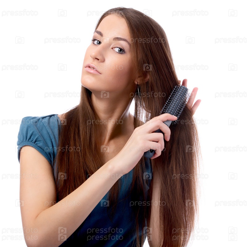 Девушка в синем платье расчесывает волосы