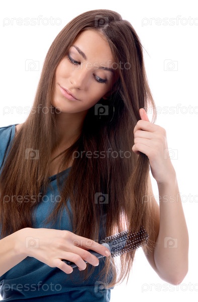 Девушка в синем платье расчесывает волосы