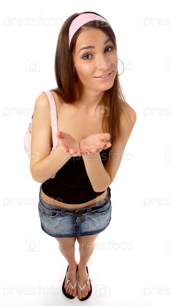 Девушка в джинсовой юбке о чем-то просит
