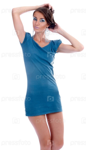 Стройная девушка в синем платье на белом